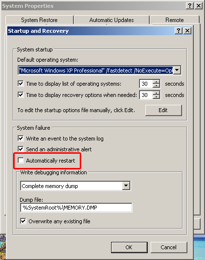 Under the System Failure section, uncheck the box next to Automatically Restart and close both windows with the OK button.