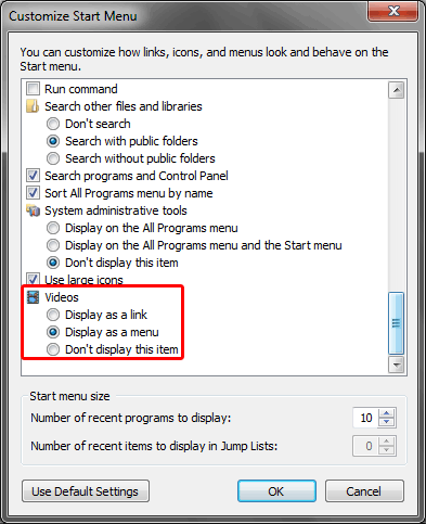 Because of the above warning and quick note just above that, I’ll be adjusting the Videos item list. Right-click the Windows orb (aka. the Start Menu button) and open up Properties. On the Start Menu tab, click Customize, then locate the Videos item in the list and select the radio button to “Display as a menu.”