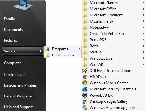 Looking at the pictures, you can see it’s not perfectly setup like it was in Windows XP. The All Programs list in the left pane is still there, and the Videos directory shows both a Programs directory and a Public Videos directory. That’s the best we can do for now. As I said though, if you don’t use Internet Explorer, adjusting the Favorites item is a great choice.