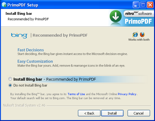 After agreeing to the End User License Agreement, it will ask if you want to install the Bing toolbar on your web browsers. Of course, you don’t need this toolbar so just say no.