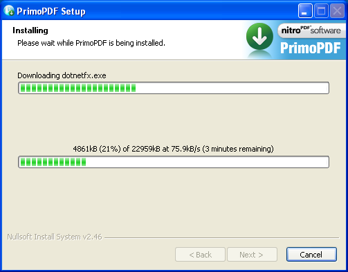 The installation will then proceed. PrimoPDF requires at least .Net Framwork version 2 (by Microsoft) to work. If you don’t have it installed, PrimoPDF will download and install it for you.